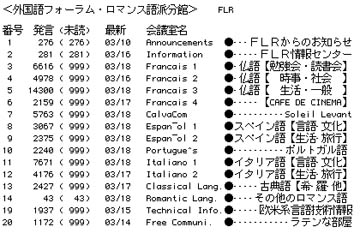もうひとつは「外国語フォーラム・ロマンス語派分館(FLR)」です.ここは「外国語フォーラム(FL)」の分館で,語学をおもな話題にしているところです.フランス語関係では「仏語【勉強会・読書会】」「仏語【時事・社会】」「仏語【生活・一般】」「CAFE DE CINEMA」「Soleil Levant」など五つの常設会議室が設置されています.