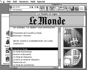 現在,フランスでいちばん人気のあるパソコン通信サービスは,アメリカのCompuServeでしょう.パリやリヨンなどの大都市には接続のための直接ノードが置かれており,アメリカ国内とおなじ料金で利用できます.94年以降の相次ぐ値下げにより,かなりのフランス人がCompuServeに加入しました.現在はフランス人が運営ふるフォーラムがいくつもあります.