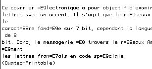 Eudora Liteを使ってWanadooのサーバからフランス語テキストをNIFTY-Serve宛に送信したとしましょう.Quated-Printableを指定していなければ,8 bit文字はそのままの形で中継されていきます.結果,NIFTY-Serve側ではやたら画数の多い漢字だらけの文書を受信します.WindowsなどLatin 1を採用しているシステムなら,このテキストを欧文フォントで表示すれば,もとのテキストに復元されます.たいていの場合は.他方,Quated-Printableを指定して送信すると,アクサン文字の部分が「=E9」とか「=E8」に置き換わっています.ASCIIでは表示できない文字を,このようなコード番号で代用したわけです.