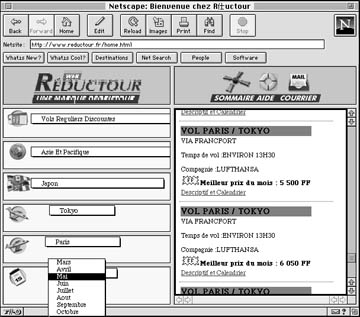 旅行業者もなウェブを実験的に構築しはじめています.Reductourはフランス発の国際線航空便のスケジュールや,各社の割引料金がわかるようになっています.フレームを多用しているために,画面の狭いモニターでは見づらいかもしれませんが,各フレームが独立した選択肢になっているので,いろいろなケースを簡単に調べられるようになっています.