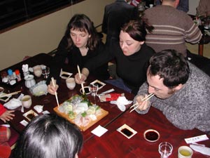 刺身が出てくるや、彼らは歓声をあげて食しはじめる。サザエの壺焼き、イワノリなども追加。どれもこれも、彼らはすっかりと気に入ったようだ。