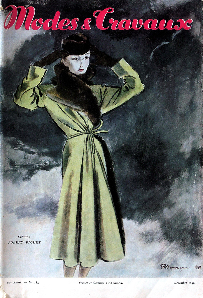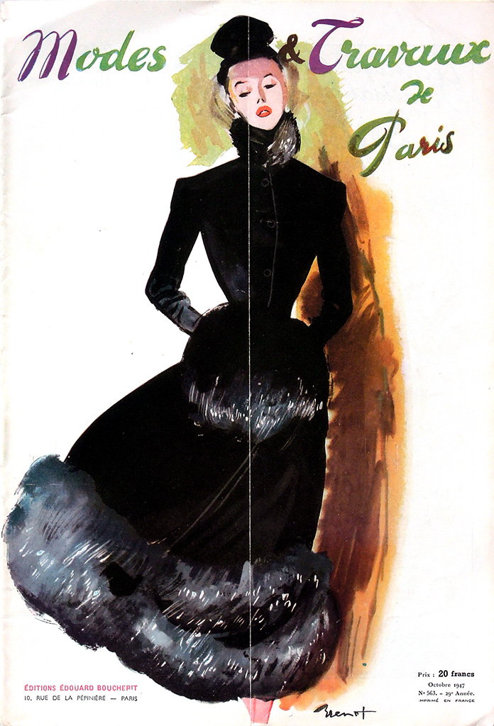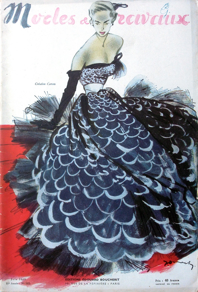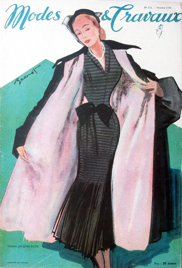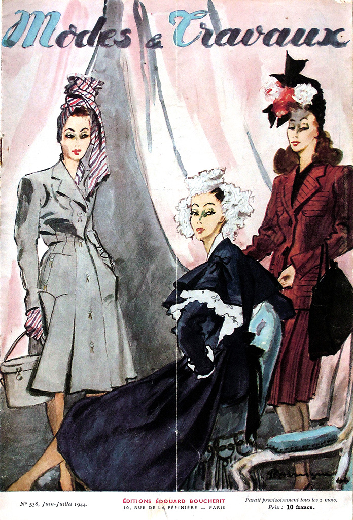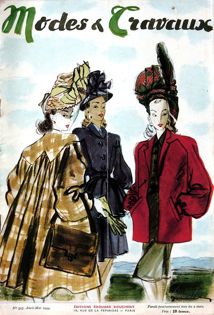 出版事業の暗黒時代ともいえる1940年代前半にあって、表紙のデザインは1930年代後半の傾向を維持して「おしゃれ」が前面に出ているあたりに、出版社の意地を感じます。1941年時点では月2回発行していたようですが、1942年には月刊になっています。他誌の動向を踏まえれば刊行ペースが落ちるのはやむをえないことでしょう。1944年には二ヶ月分の合併号となり、実質的に隔月化しています。表紙には価格が表示されています。1936年に4フランだったのが1940-1941年には5フランと緩やかに上昇したのに対し、1942-1943年には7.5フラン、1944年は10フラン、1945年は15フラン、1946年にはついに20フランと、急速に値上がりしています。そして1947年は20フランのままでしたが1948年は30フラン、1949年にはついに40フランとなりました。10年間で10倍の値上げというように、戦後の激しいインフレの影響がうかがえます。