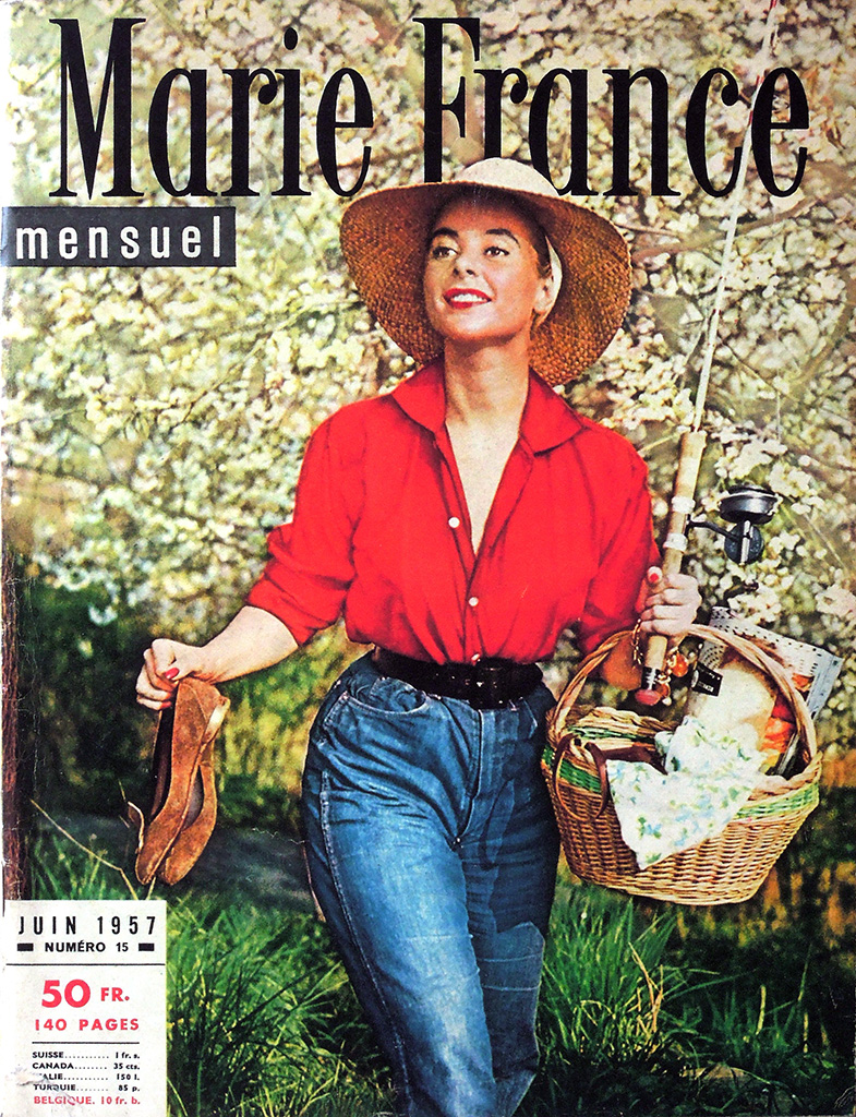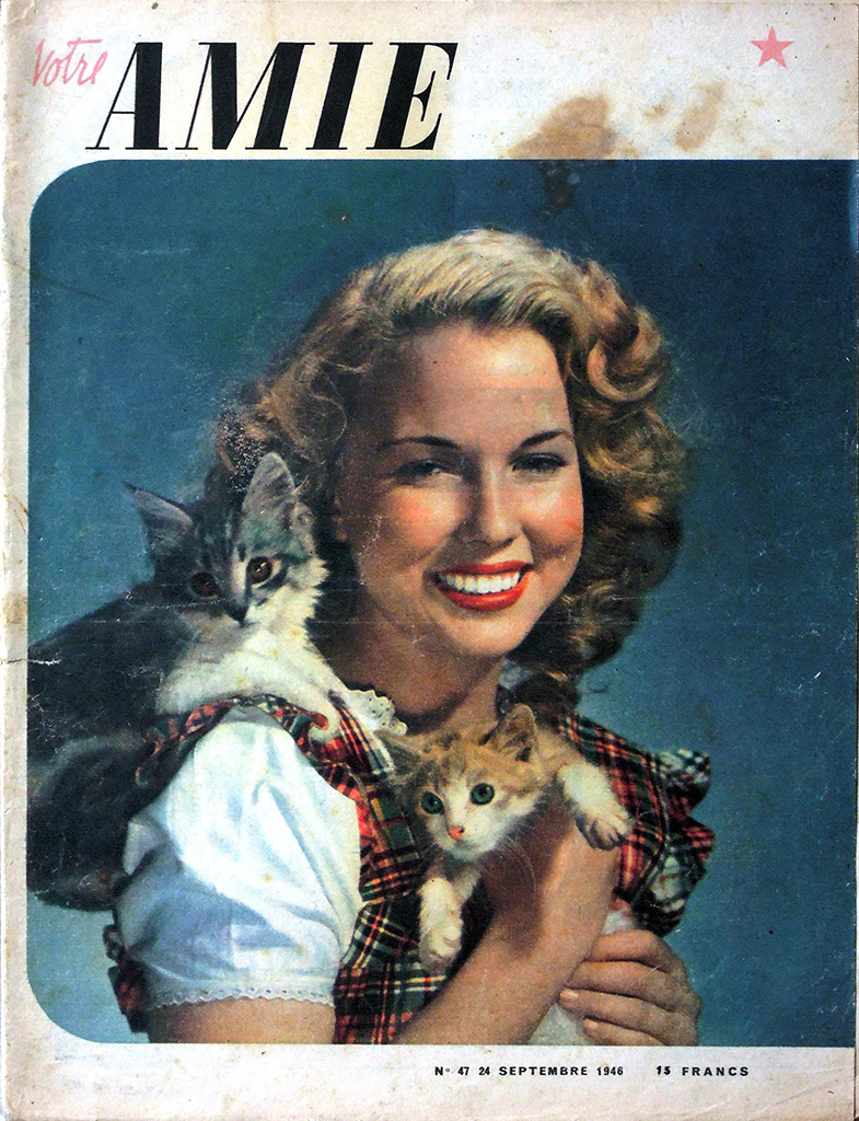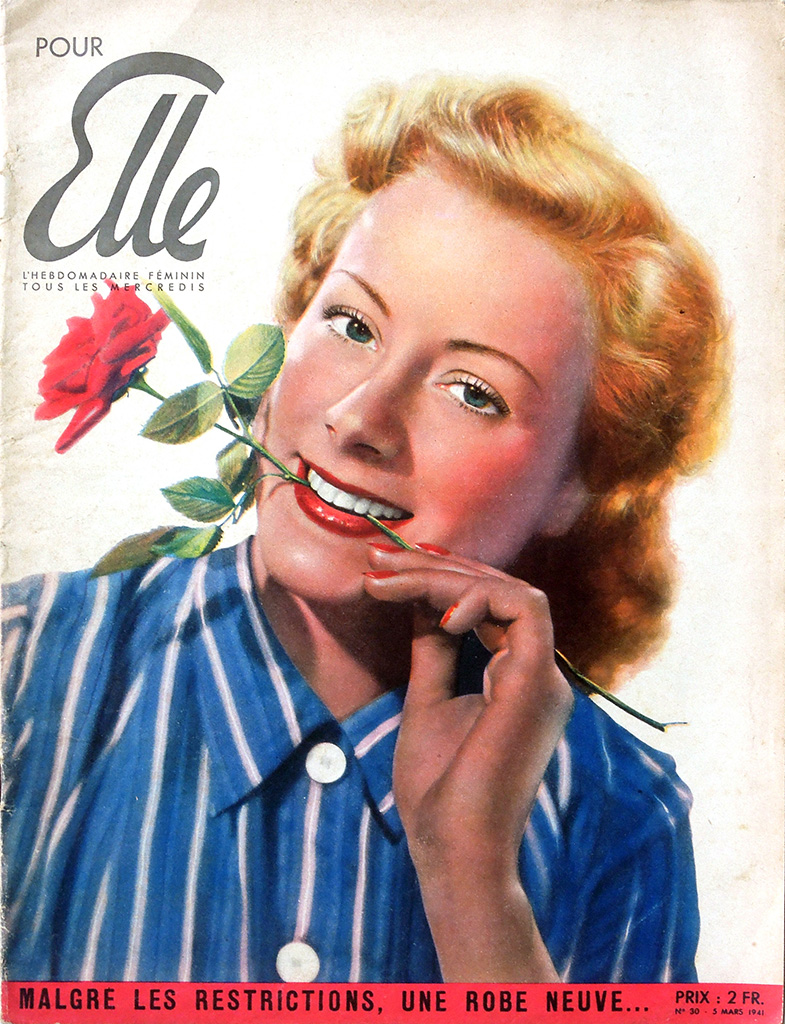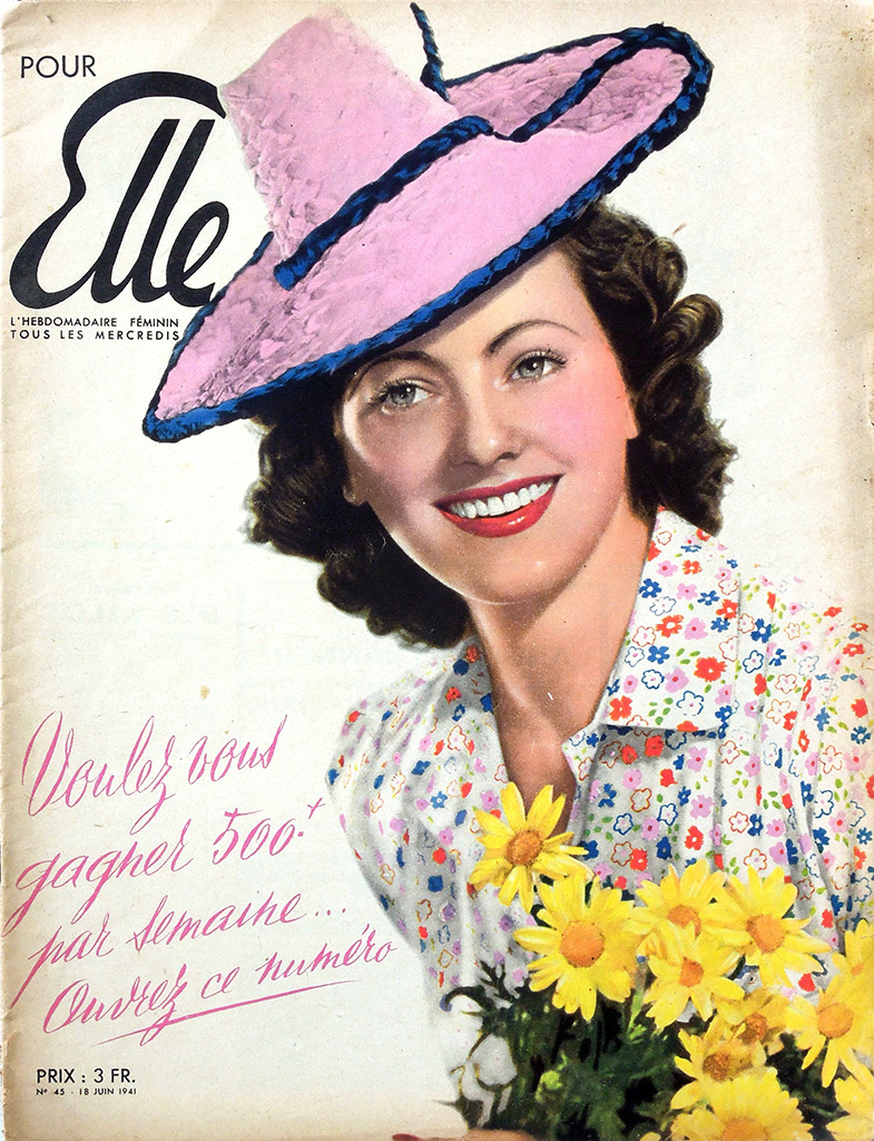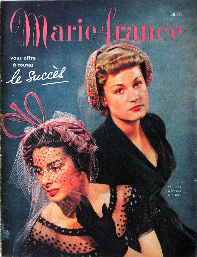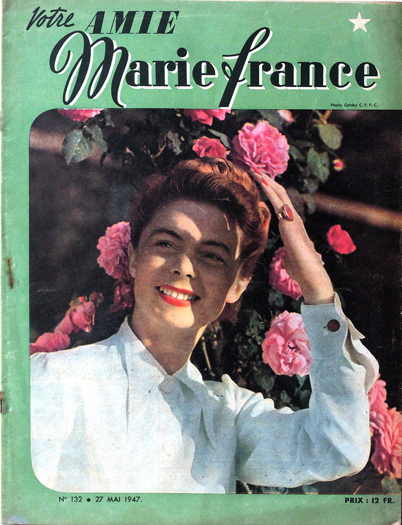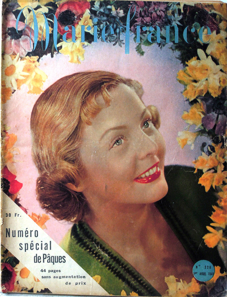 第二次大戦中のナチ占領下のパリでレジスタンス・グループLa rue de Lilleを支援していた出版事業者Emilien Amauryは女性誌"votre AMIE"を買収し、パリ解放後に週刊誌"Marie France"を創刊しました。この誌名は"Marie*Claire"を強く意識したもので、当初ヴィシー政権に協力的だった"Marie*Claire"経営者のJean Prouvostへの反発から、誌名にFranceを入れたようです。なお、1947年の途中までは"Marie France"の誌名のそばに"votre AMIE"が併記されています。