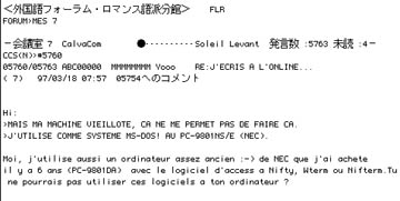 初期のCalvaComはKDDの国際パケット交換網Venus-P経由で接続できたため,日本からも何人か利用しているました.そのうちの一人,藤野満さんの努力によって,89年11月にはCalvaCom内に「Soleil Levant(日,出ずる処)」という電子掲示板が設置されました.これは日本とのあいだでメッセージ交換をおこなうためのもので,日本側はNIFTY-Serveの外国語フォーラム内に専用会議室が設けられ,ここに掲載されたメッセージはCalvaComのSoleil Levantに,Soleil Levantに掲載されたメッセージはその会議室に転載されます.当時は海外のBBSに接続できたのはごく一部の人だけでしたので,藤野さんの地道な転送作業は,日仏をつなぐ貴重な交流ルートでした.実際にSoleil Levant会議室のフランス人メンバーと,NIFTY-Serve側会議室のメンバーとが,東京やパリでオフライン・ミーティングをおこなったこともあります.