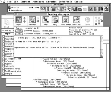 CIM(CompuServe Information Manager)というソフトでCompuServeを利用する場合は,SettingでHost Caracter Setを「Latin 1」にすれば,問題なくフランス語を使えます.ターミナル型ソフトが主流だったころは,フランス関係のフォーラムでも発言にはアクサン文字を使わないのが普通でした.しかし,現在はほとんどの人がちゃんとした綴りで書いています.