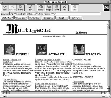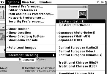 こうした錯綜した状況のなかで,どうやってフランス語を利用すればいいのか? まず,ホームページ(Page d'accueil)の閲覧だけなら問題はありません.Netscape NavigatorやInternet Explorerをお使いであれば,Document Encodingを「Western(Latin1)」にするだけです.これでアクサン文字を画面にちゃんと表示させられます.