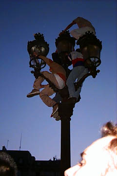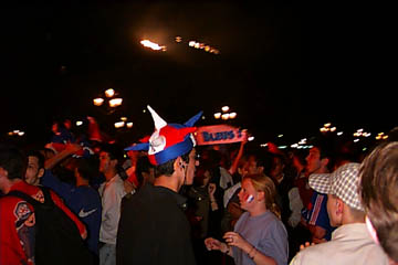 夜10時ぐらいになってようやく薄明がかすかになる。どの街灯にもスクリーンを見ようとする連中数人がよじのぼり、国旗をはためかせていた。この写真を撮ったすぐあとぐらいに、クロアチアが先制点を入れ、大観衆からブーイングと溜息が。もちろん僅かながらいたクロアチアのサポーターは大はしゃぎだったが。