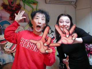 ほんの三十分だけの予定のサミュエルは2時間、ヴィオレーヌにいたっては、1時間半の予定が3時間半にわたって面談したのであった。楳図さんも、「せっかくいらしていただいたのだから、もう少しお話ししましょうか」と言ってくださった。長時間の通訳は疲れたが、それでもヴィオレーヌたちの幸せそうな表情に接すると、いい仕事をしたという満足感が大きかった。最後は例によって「グワシ!」の記念写真。
