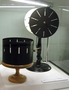 会場でヴィオレーヌたちに会う予定だったが、電話がつながらないので、適当にあちこちの展示場を見てまわる。最初に入ったブースで、フェナキスティスコープの現物が展示されていた。メディア史の授業に使えると思い、デジカメで撮影。