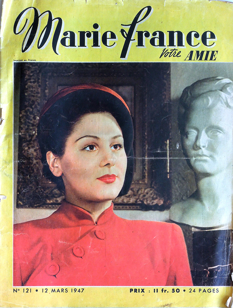 第二次大戦中のナチ占領下のパリでレジスタンス・グループLa rue de Lilleを支援していた出版事業者Emilien Amauryは女性誌"votre AMIE"を買収し、パリ解放後に週刊誌"Marie France"を創刊しました。この誌名は"Marie*Claire"を強く意識したもので、当初ヴィシー政権に協力的だった"Marie*Claire"経営者のJean Prouvostへの反発から、誌名にFranceを入れたようです。なお、1947年の途中までは"Marie France"の誌名のそばに"votre AMIE"が併記されています。